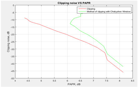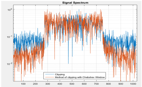 Также, кроме обычного порогового клиппирования сигнала проверен метод клиппирования с  применением оконной функции. Выбрав оконную функцию Чебышева, которая давит довольно сильно внеполосные излучения сигнала, и помимо пика, срезает некоторые значения до и после. Диапазон вырезаемых значений до и после зависит от ширины оконной функции.