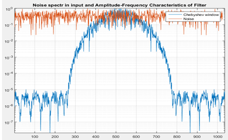 Из рисунков видно, что внеполосные излучения при использовании ОФЧ (оконной функции Чебышева) ниже, но при одном и том же значении пик-фактора мы получаем большее значение шума, т. к. мы вырезаем не одно значение, а несколько (в нашем случае — 13). АЧХ ОФЧ на 13 точек представлена на рисунке 8. На графике приводится также АЧХ белого шума, подающийся на вход фильтра.