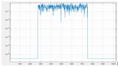 Для получения разных значений OFDM сигналов на каждой итерации (моделирование максимально приближено к реальности ситуации, когда необходимо генерировать абсолютно разные данные абонентам) использовали randomize.   Для того, чтобы наиболее точно промоделировать систему использовали следующую логику. Так как на каждую из несущих может приходиться разное количество абонентов, то соответственно разным несущим требуется разное количество информации. Соответственно, генерируя спектр сигнала следует генерировать шум, который описывает разный уровень информации в поднесущих. Моделируемый спектр сигнала представлен на рисунке 1.